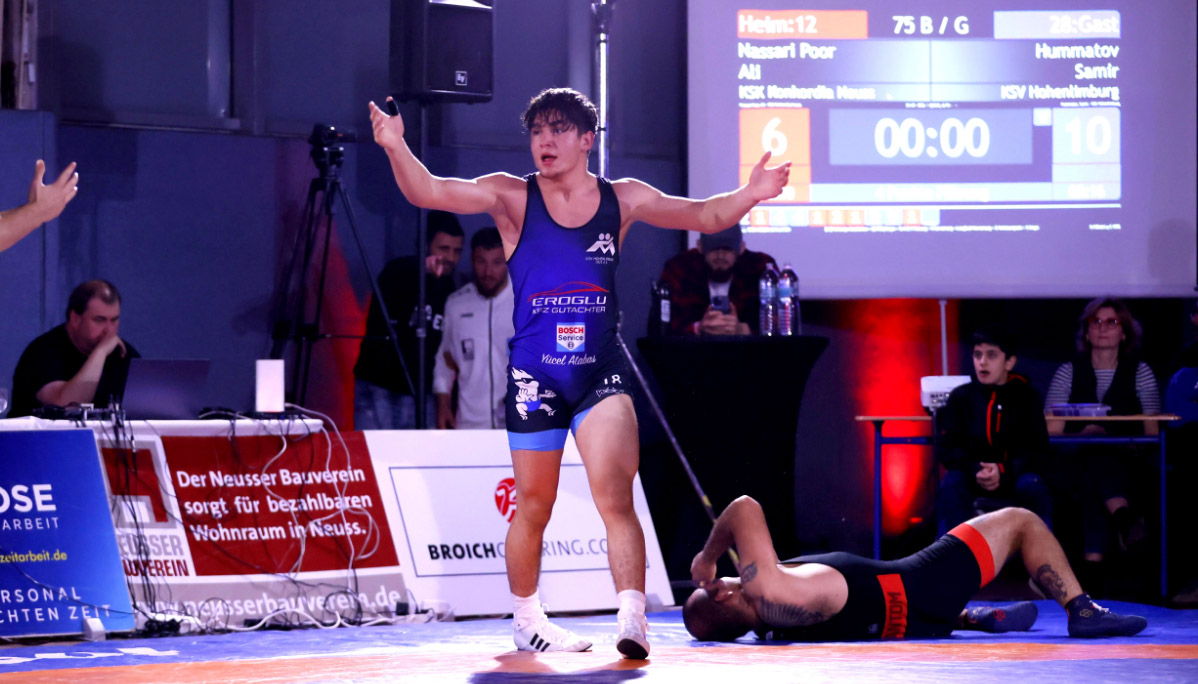 75 kg (GR) – Zum Abschluss sorgte der erst 15-jährige Samir Hummatov für pure Begeisterung. Gegen den doppelt so alten und bis dahin ungeschlagenen Iraner A. Nassari zeigte er einen mutigen, kämpferischen Auftritt und gewann mit 12:6 (siehe Titelfoto). Ein Auftritt, der das Publikum begeisterte und den Abend krönte!